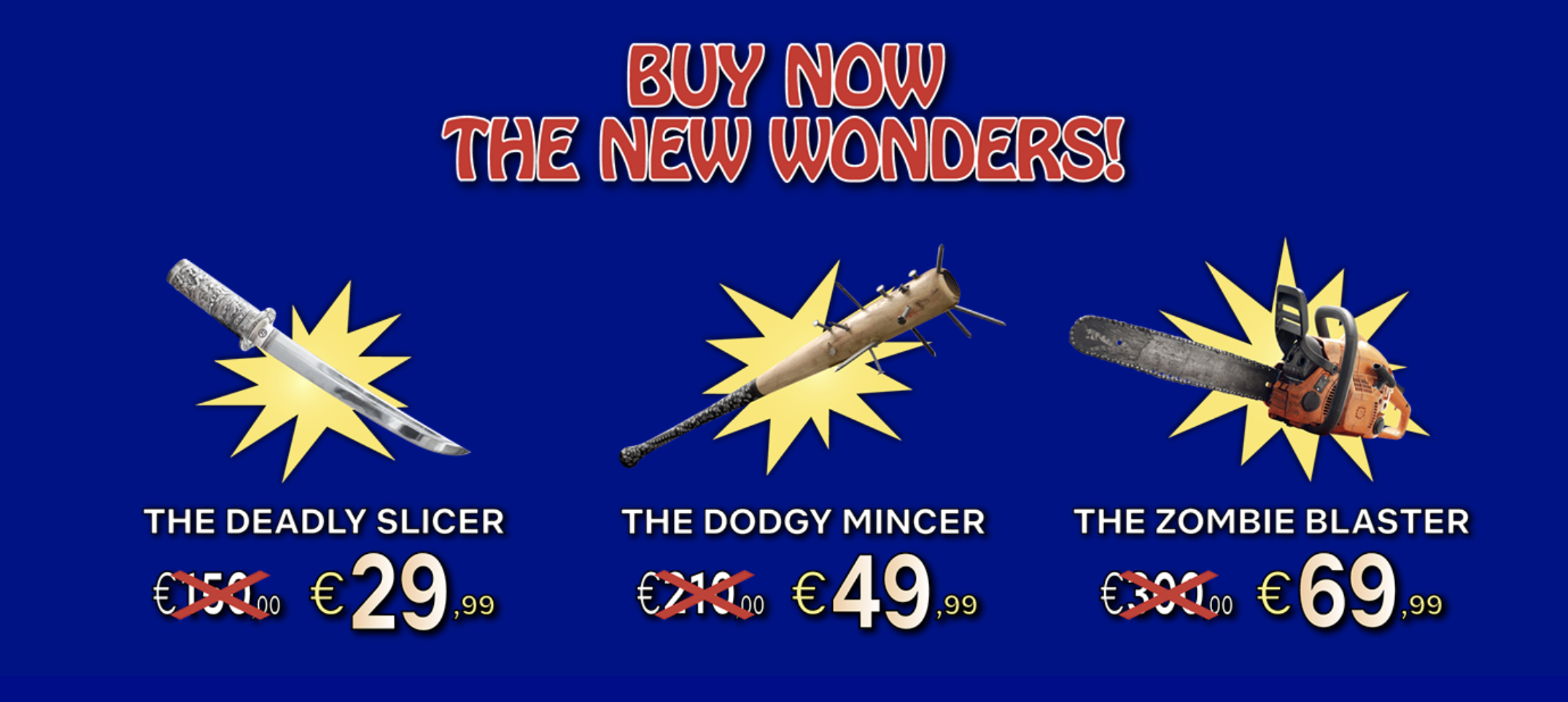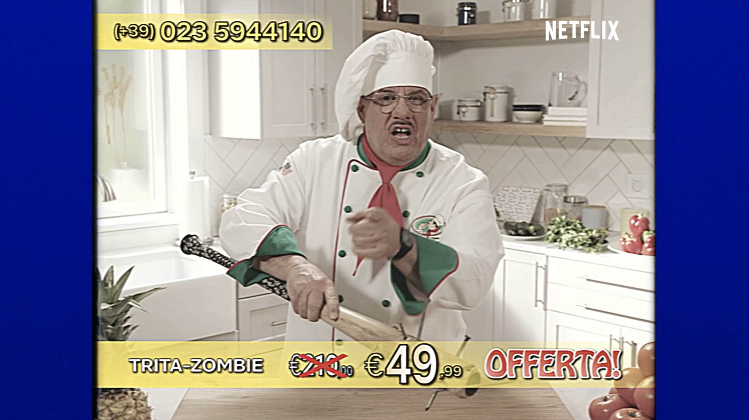 Ladies and gentlemen, Chef Tony, the legendary master of knives is back and has a special task: introduce us, thanks to his legendary teleshopping, to his New Wonders, the weapons the protagonists need to face the zombies of Army of the Dead.